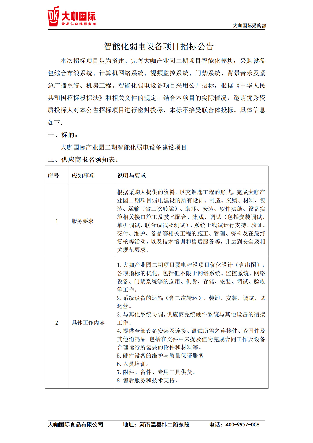大咖国际食品有限公司因业务扩展,现进行空压机项目公开招标